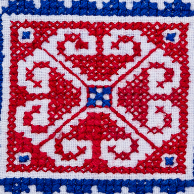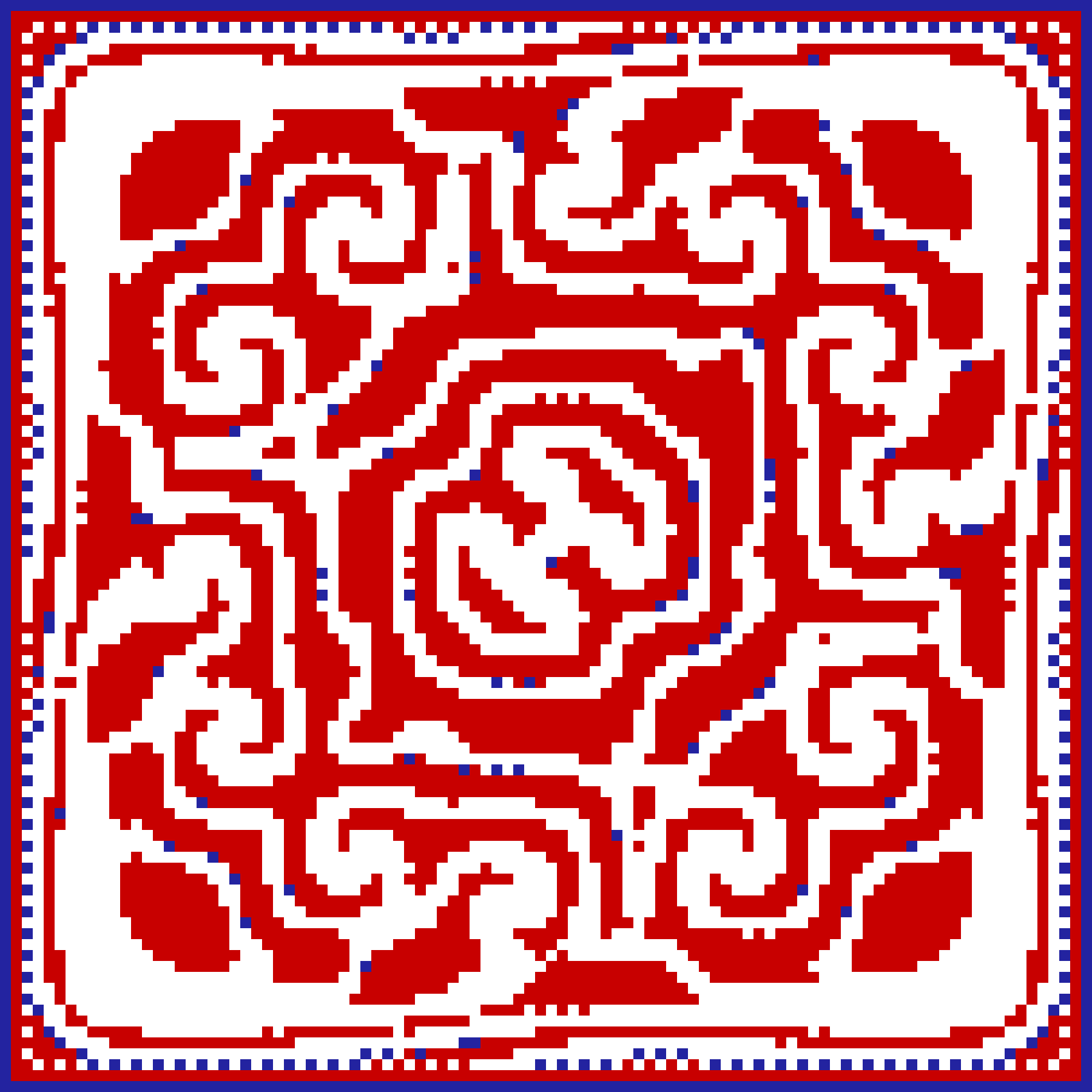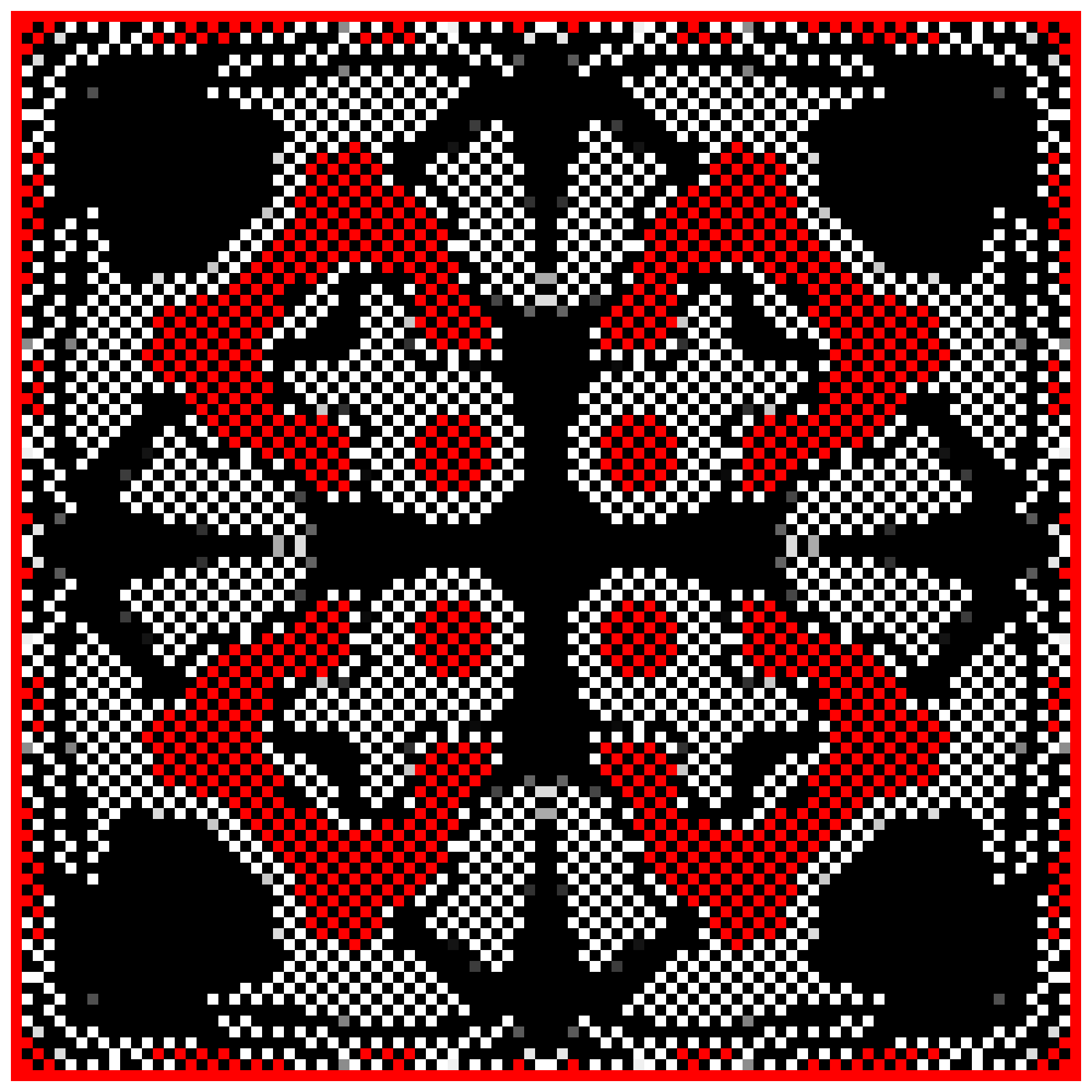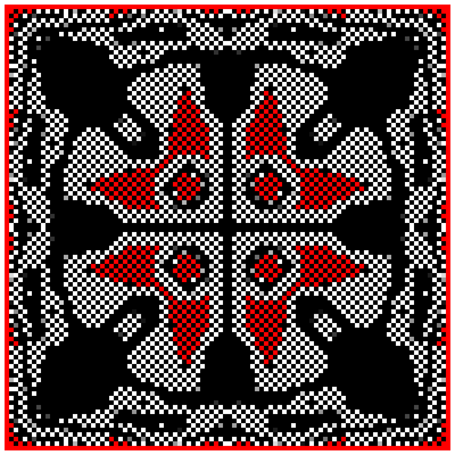 Take, for instance, the pixel-like symmetry and nested geometric shapes of Romanian embroidery patterns, often seen on traditional textiles. The motif on the left, with its grid-based repetition and bold red-white contrast, shares an uncanny visual logic with the RD-generated design on the right. Though born from different systems—one cultural, one algorithmic—both arrive at structured, mirrored compositions built from small units interacting in space.