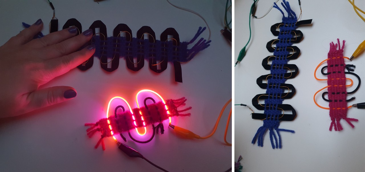 Figure 7: A capacitive touch sensor passementerie sample controlling the lighting of an LED passementerie sample with an Adafruit ‘nOOd’ flexible LED strip as decorative weft.