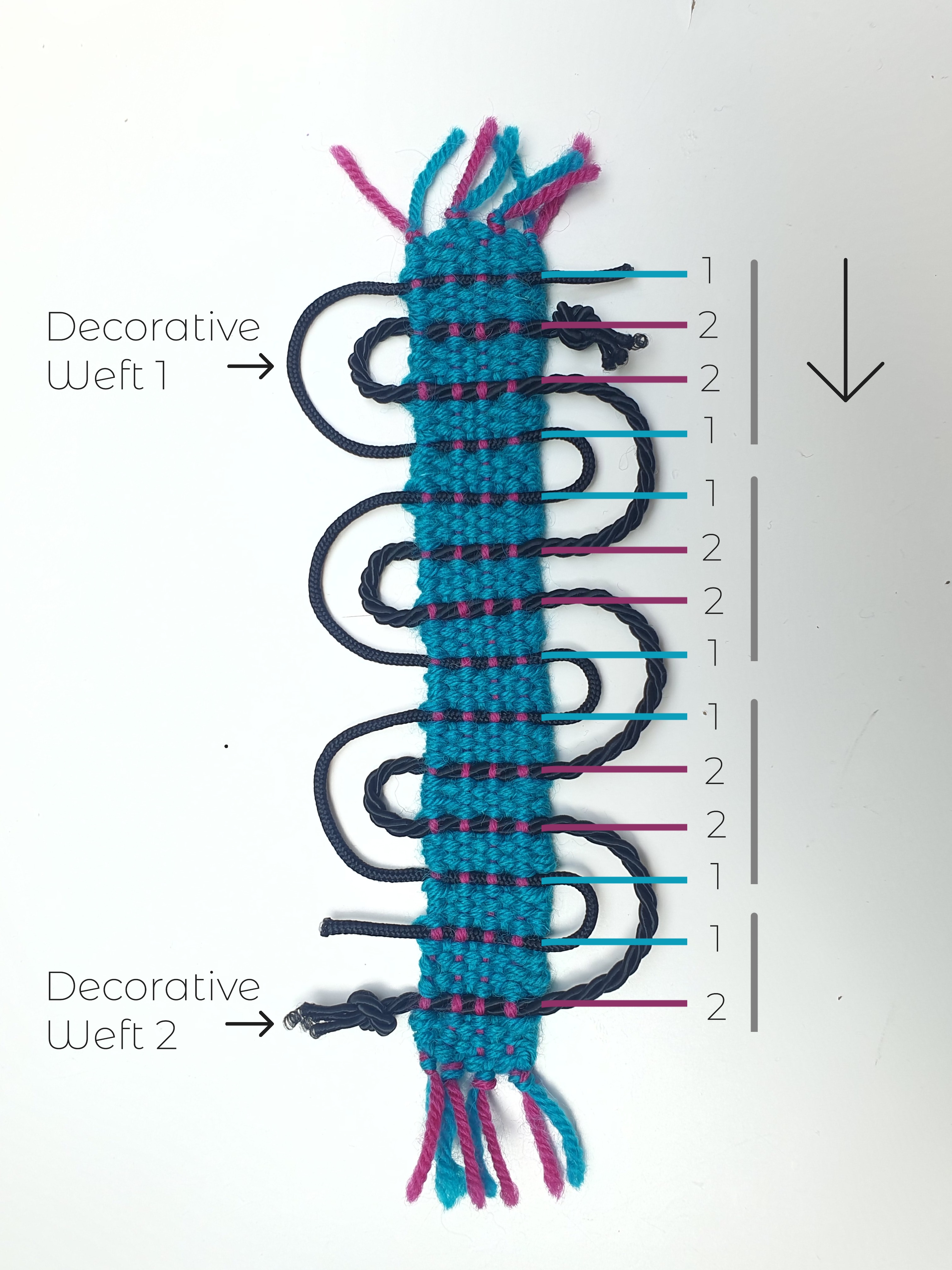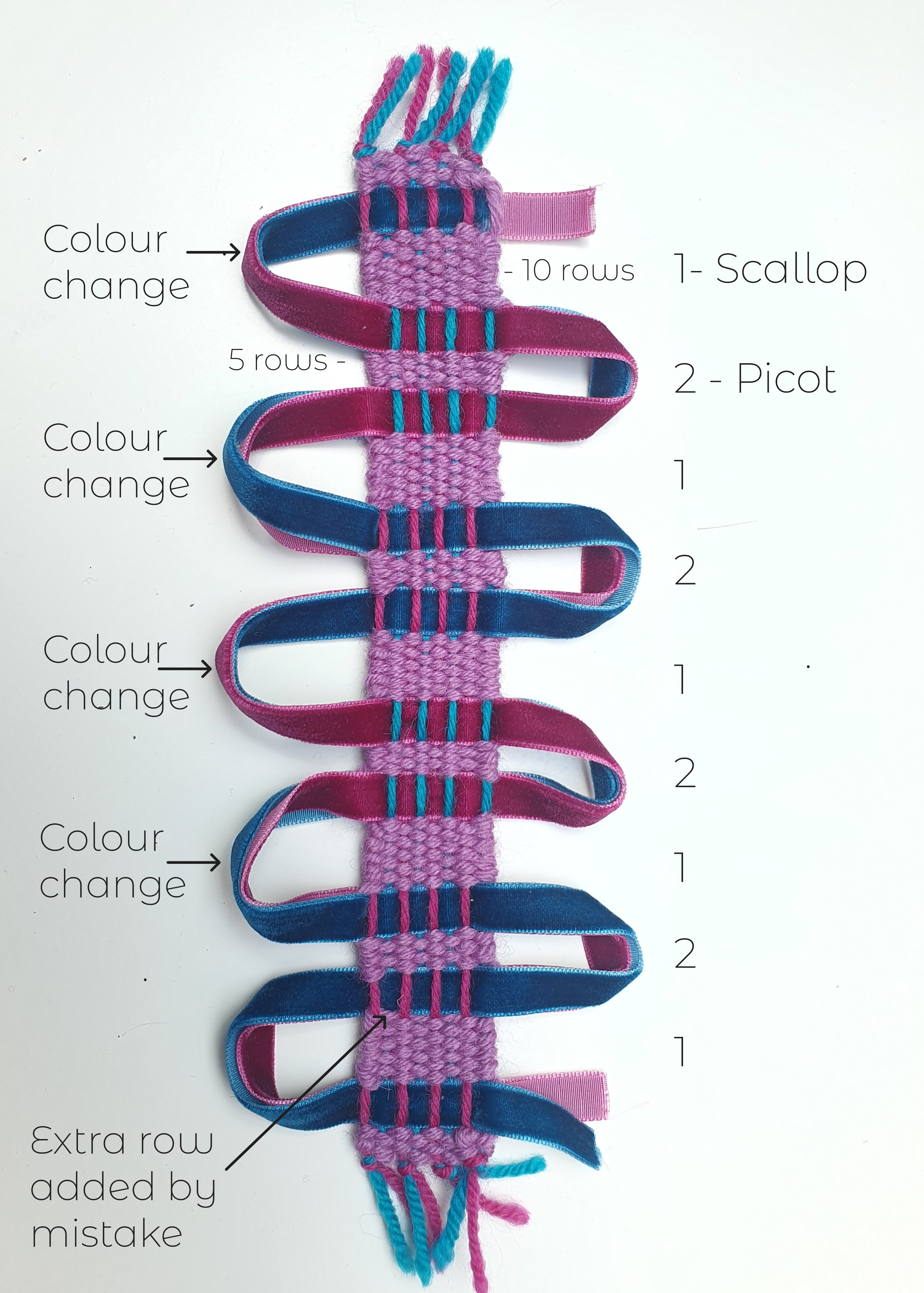 Figure 3 depicts two more examples. These were woven in a passementerie masterclass by Elizabeth Ashdown, which I was able to participate in to get hands-on experience with the craft. I am using terminology from her book (cited above), which can be referred to for more information. In the left-hand sample, the number of main body weft rows alternates between 5 and 10. This creates wider loops (“scallops”) on the left hand side, and narrower loops (“picots”) on the right hand side. The ribbon used to create the decorative weft is flipped to create a colour change every 3rd decorative weft row (with one exception caused by the accidental weaving of an additional row, highlighted in the figure). This is a simple, repeating, (scallop)-(picot)-(colour change) pattern. The ‘crete’ pattern on the right hand side of the figure features two decorative wefts, woven in a symmetric 1-2-2-1 pattern that repeats. There are many permutations that can be made to these two basic patterns, e.g. varying the number of main body weft rows between decorative wefts, or changing the sequence that multiple decorative wefts are woven in, resulting in many possible patterns.