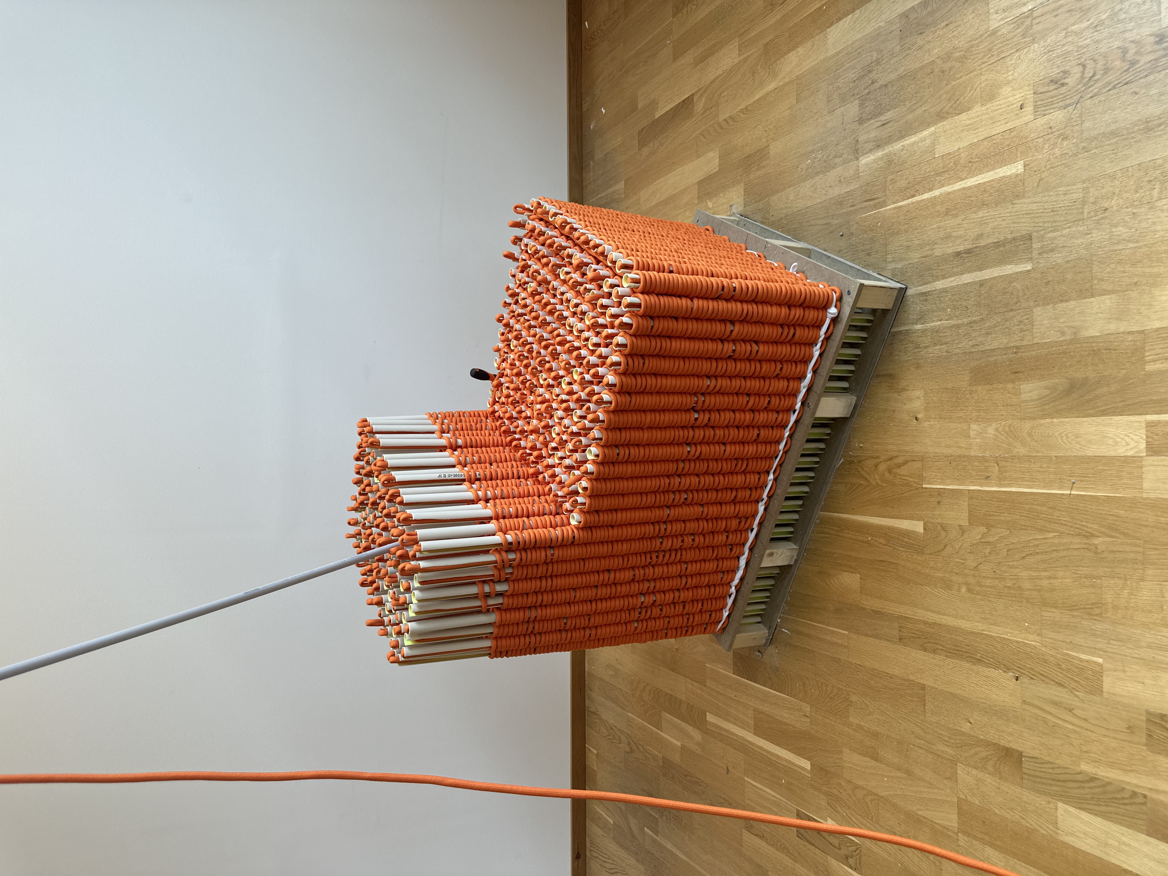 Figure 6: MultiWeave warp rows arranged in a non-parallel configuration and fixed at various angles using a flexible support structure. Material used for both warp and weft: paper yarn. Kadi Pajupuu, 2024.