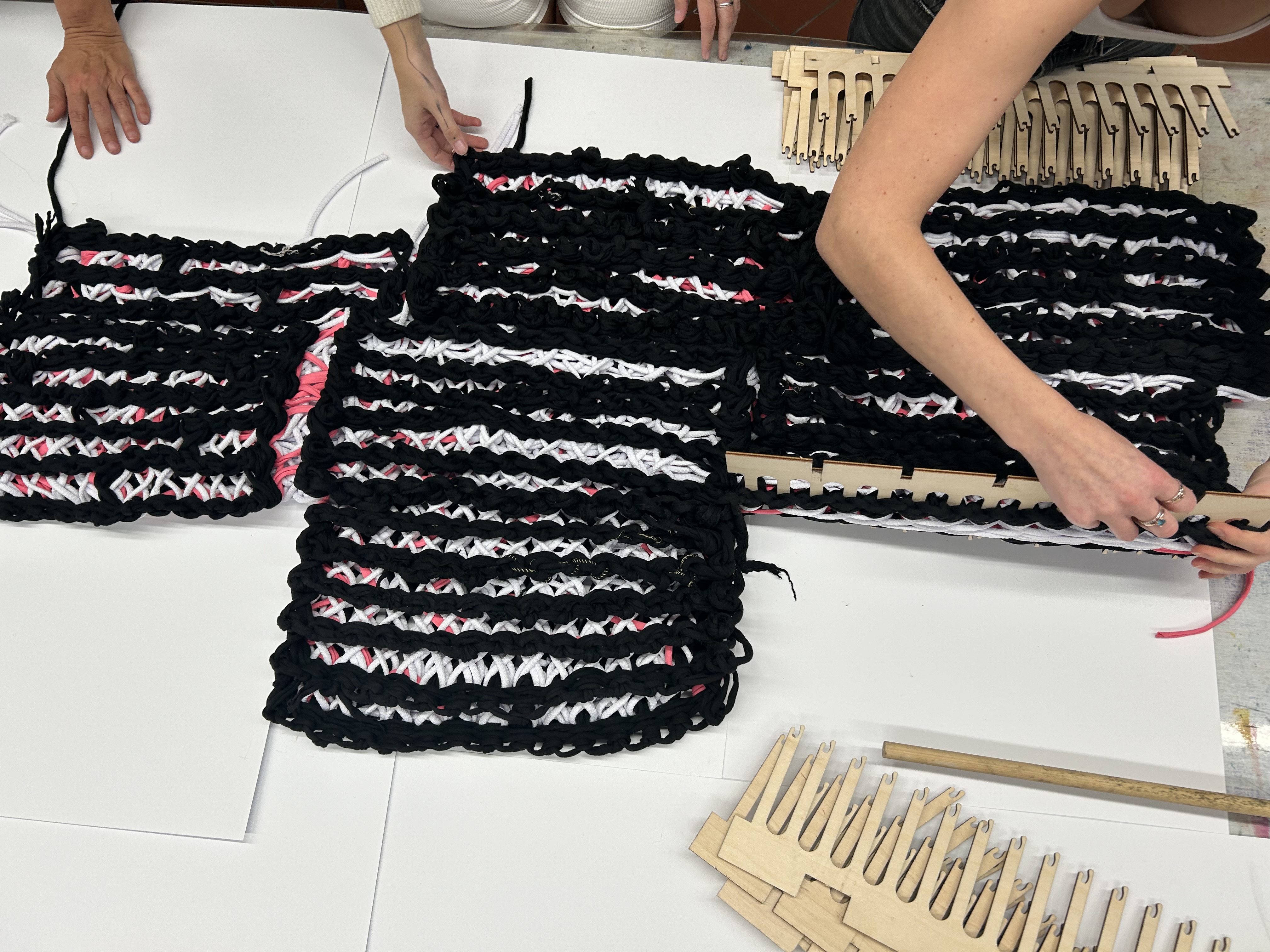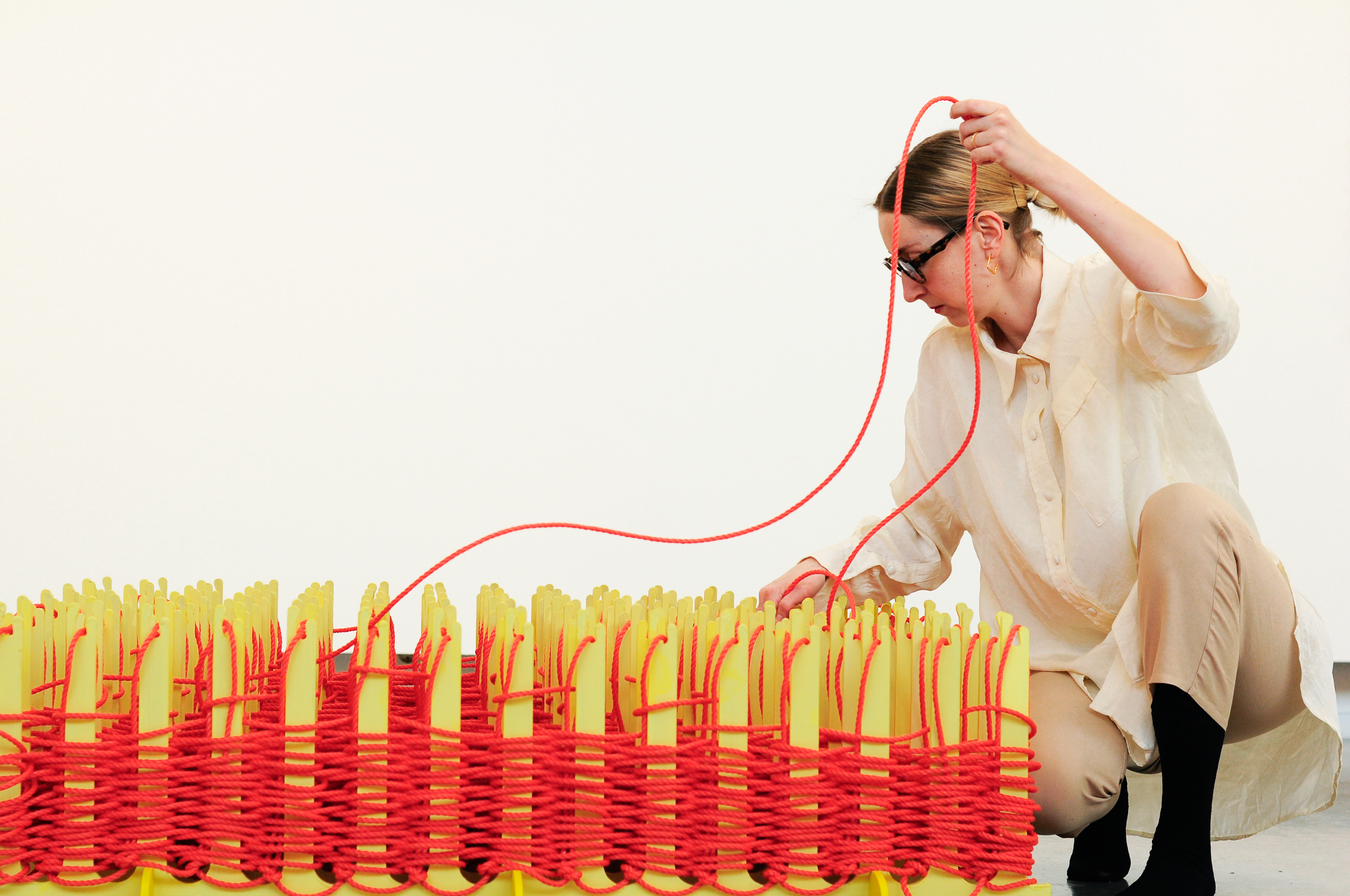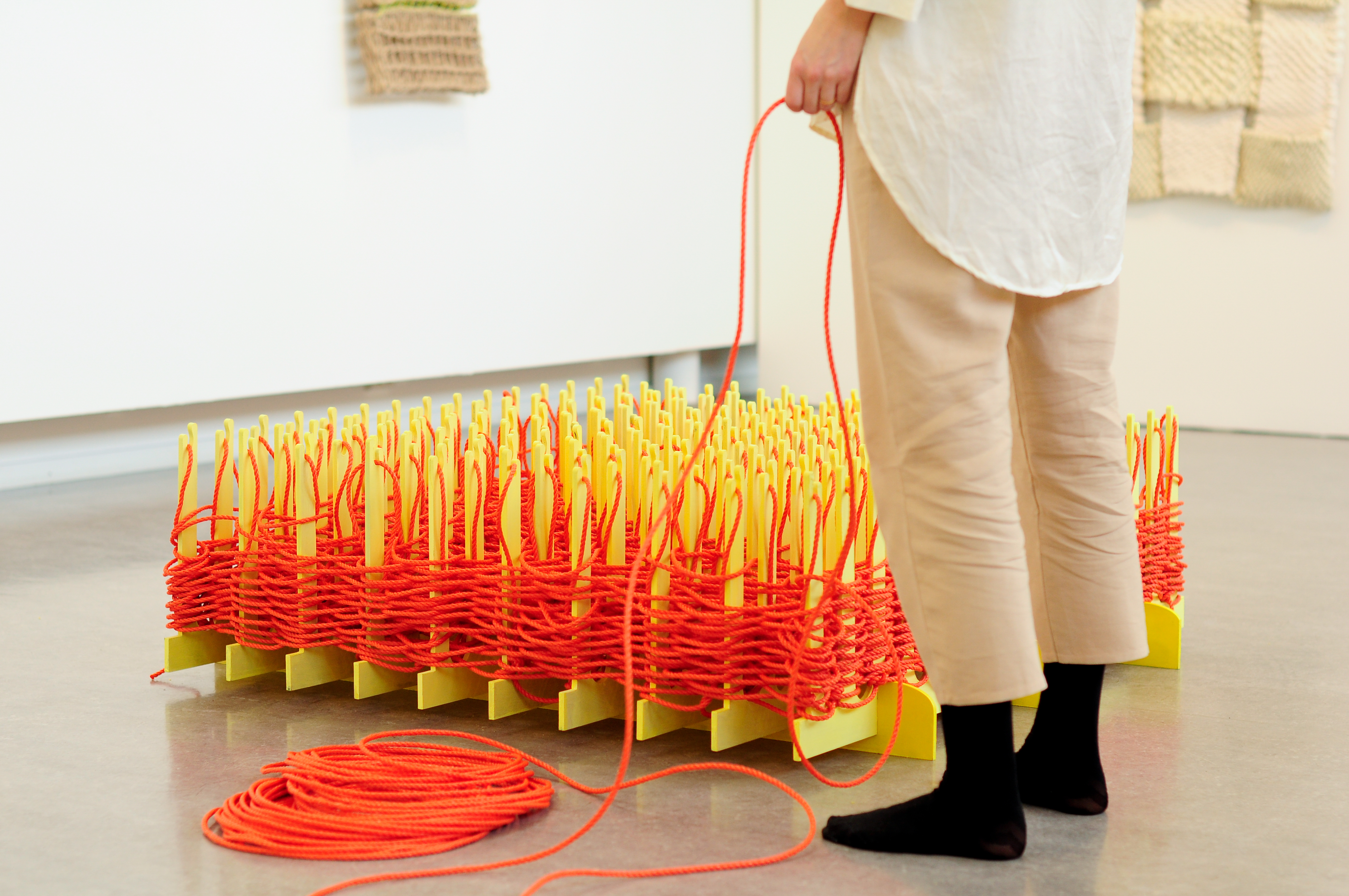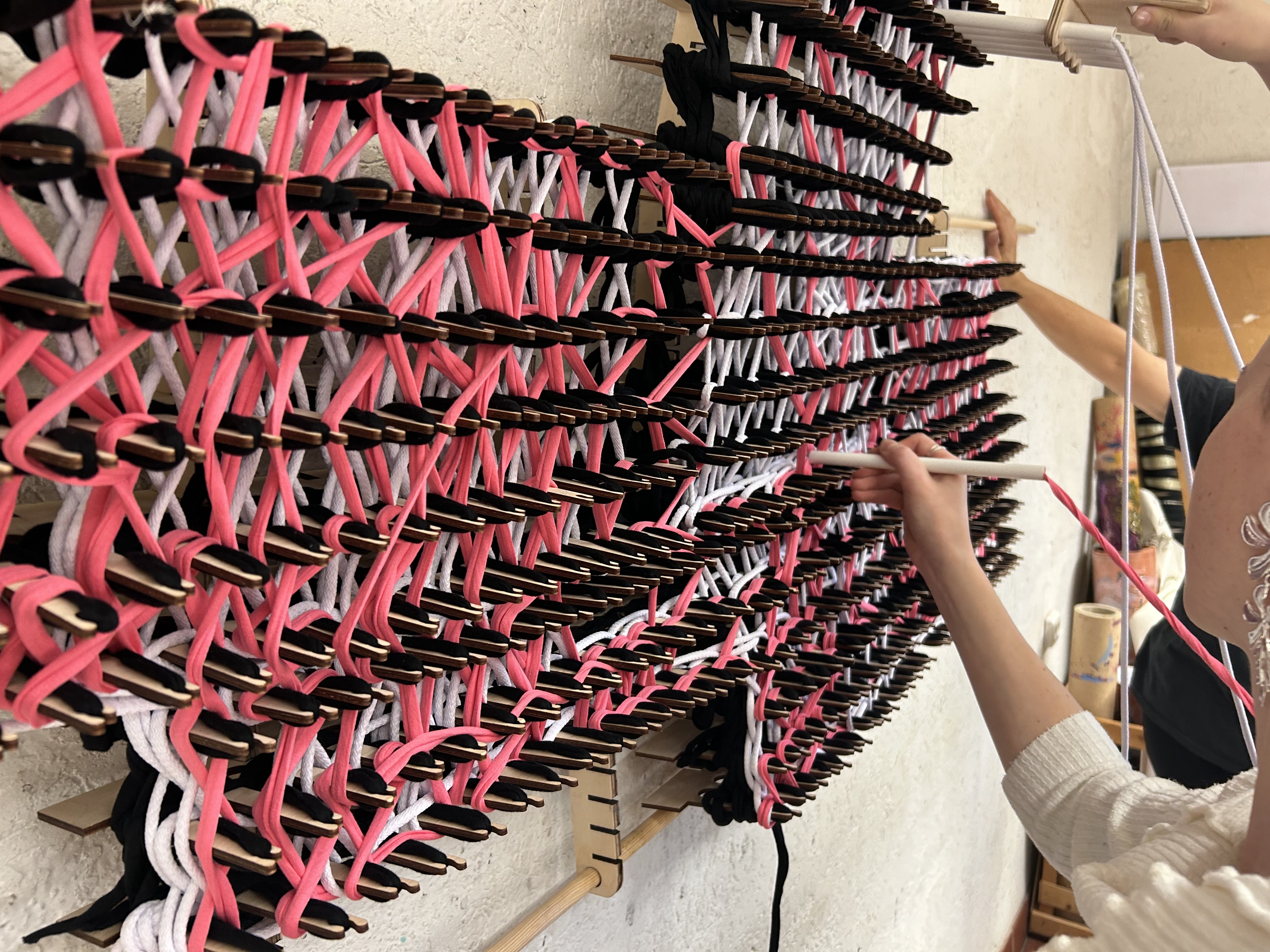 Artist Mirjam Hemström Farsi has scaled up the MultiWeave tool to architectural proportions, using it in performative installations where the act of weaving becomes a public event. In her gallery exhibitions, she constructs the fabric in real time, building both tension and audience engagement. This performative use of MultiWeave transforms it into a live medium for storytelling and spatial interaction. (Figures 13-15)
