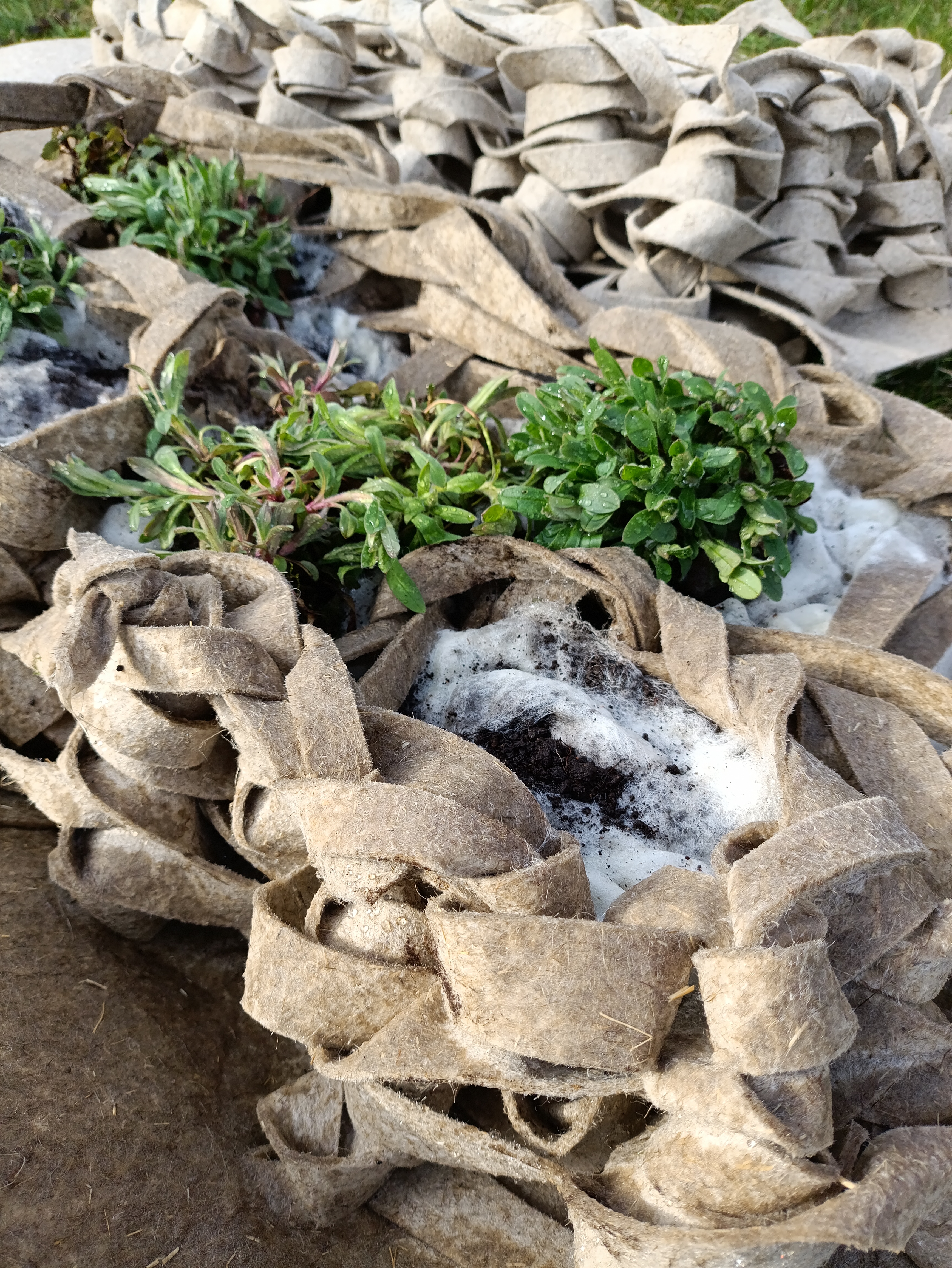 Figure 25. Module made from linen felt, filled with waste wool, soil and plants. Kadi Pajupuu. Growth and Decay.(detail, 2025). Photo Marilyn Piirsalu.