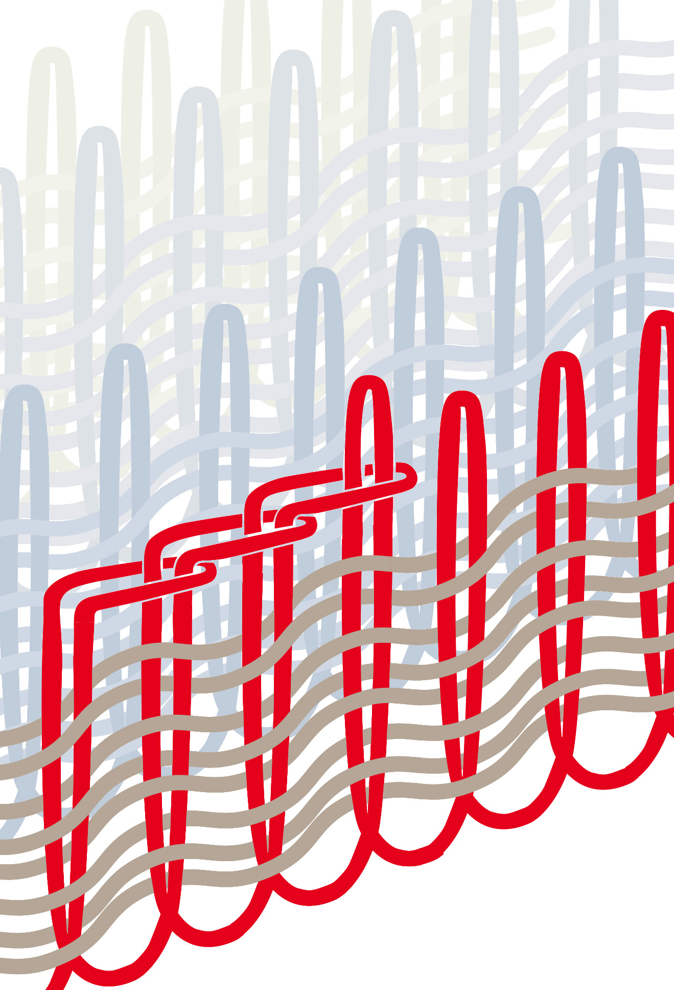 Figure 3: Final step: connecting the upper ends of warp loops to adjacent loops to stabilize the structure. Drawing by Kadi Pajupuu.